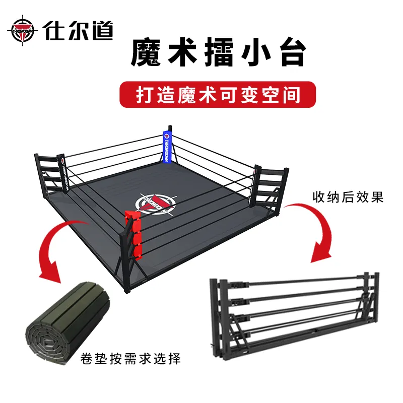 折叠拳击台可以存放。收纳后,占地面积仅为 2.5 平方米,两人可在 1 分钟内完成折叠和移动操作。它还可用于实际训练和比赛