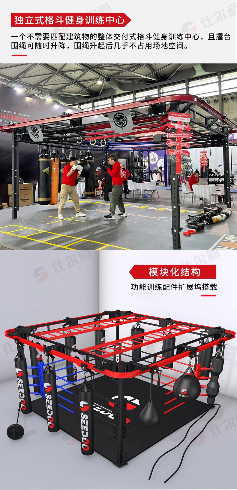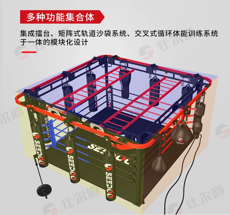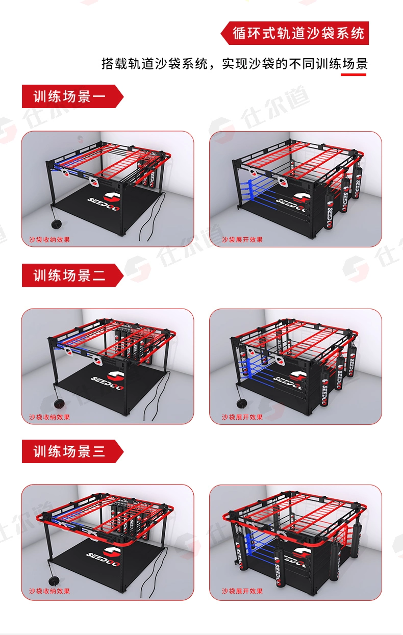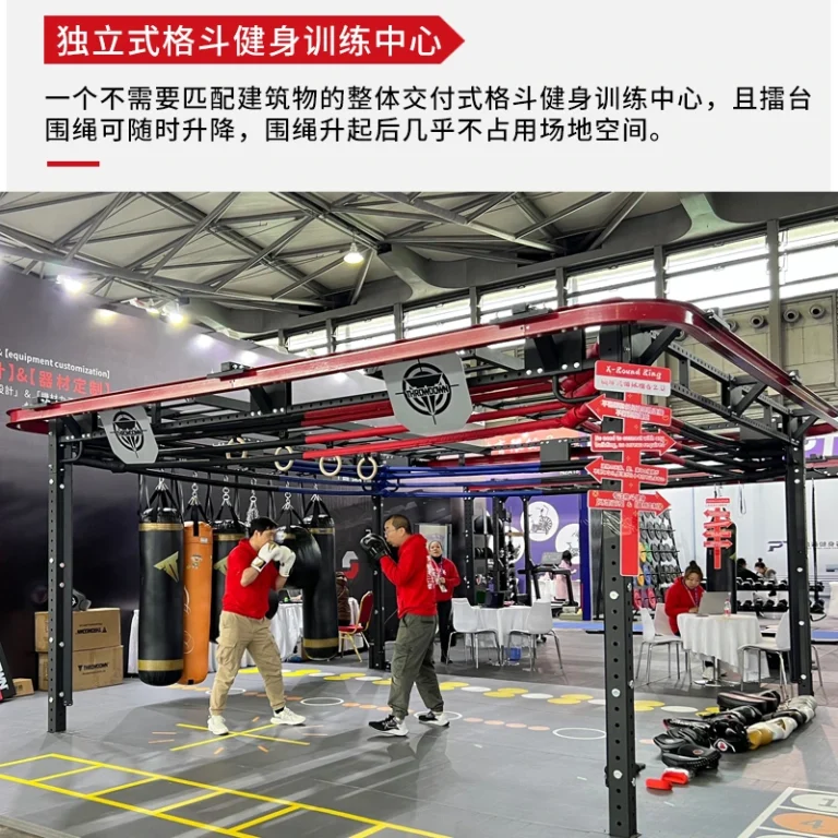 集成拳击擂台、矩阵式轨道沙袋系统、交叉式循环体能训练系统的一体化模块化设计