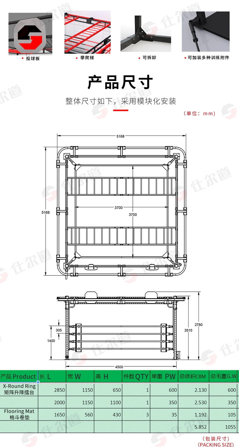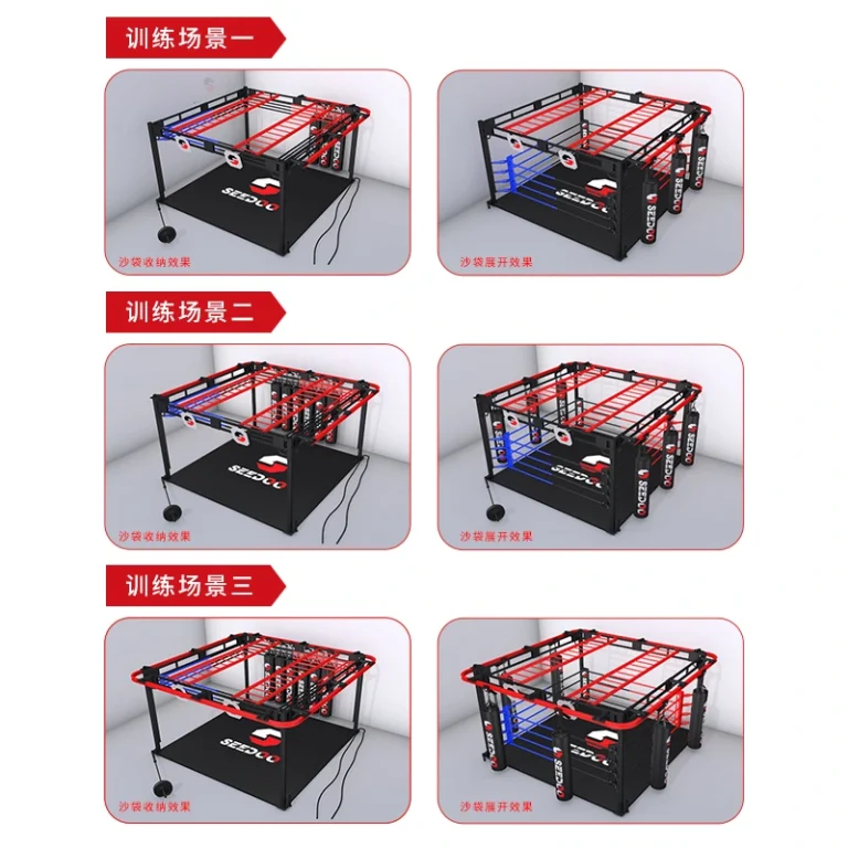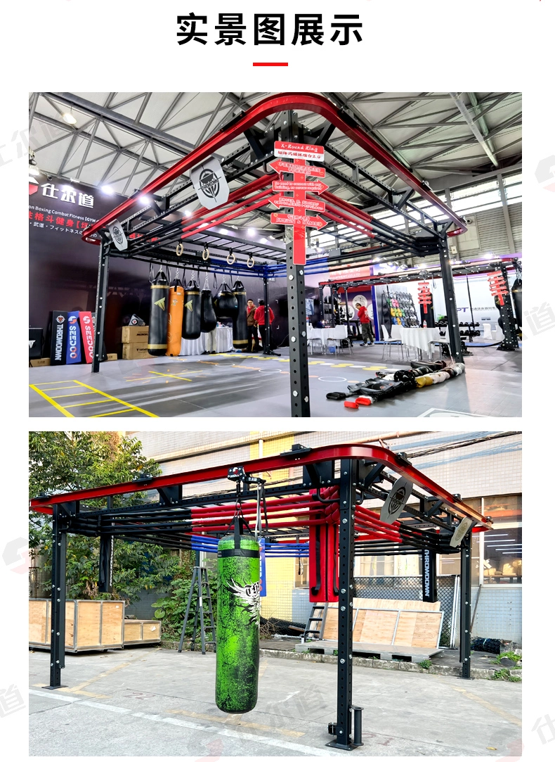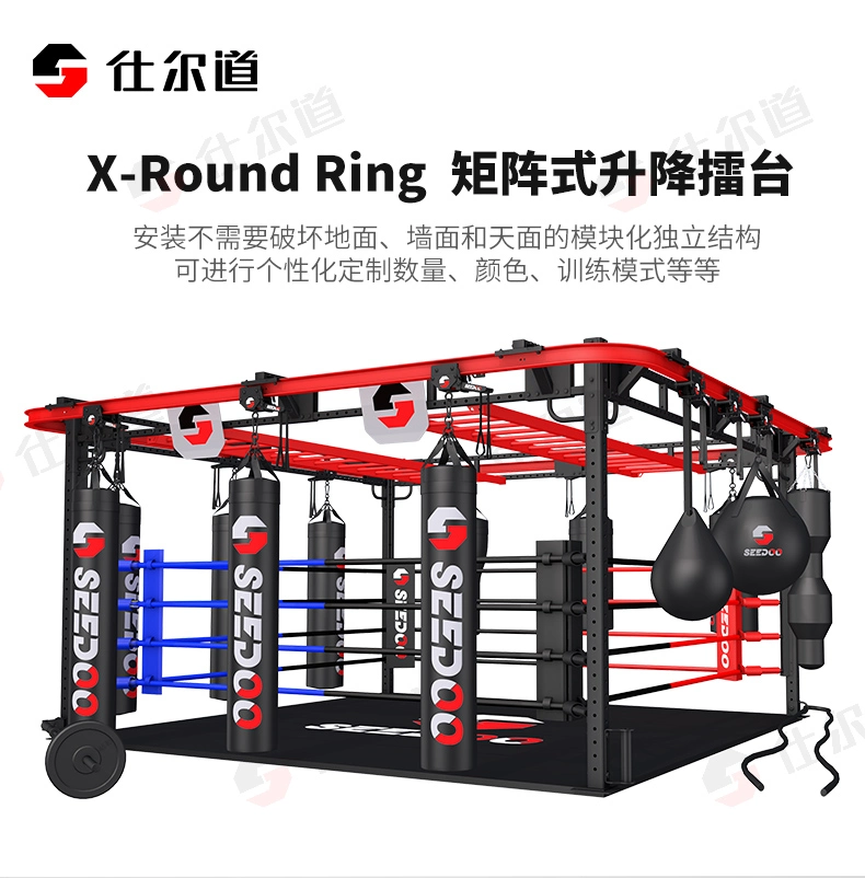 集成拳击擂台、矩阵式轨道沙袋系统、交叉式循环体能训练系统的一体化模块化设计