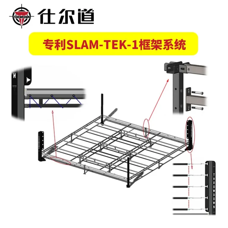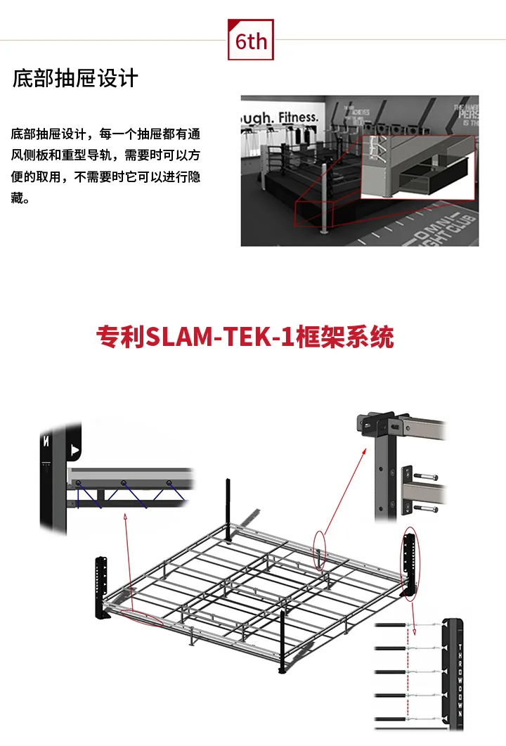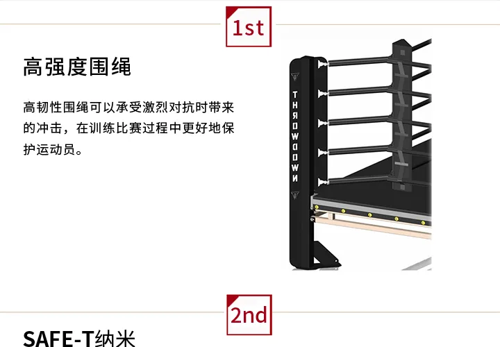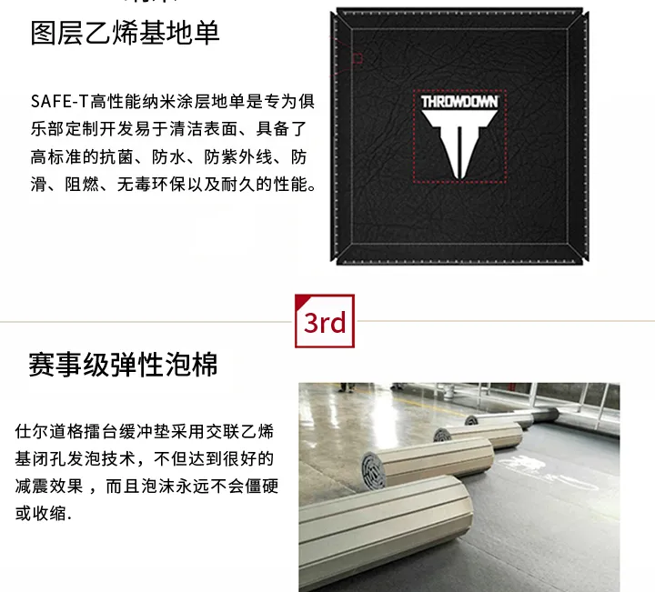 1.Throwdown仕尔道拳击台生产厂家,支持定制各种尺寸,颜色。专利slam-tek-1系统设计被证明是行业中优秀的工程结构,能为高强度的训练提供全方位的保护。这个工程结构包括一个中心舞台支撑系统和垂直的H框架部分。这个组装的系统与横向纵向梁结合连接着一起,以此保证整个舞台底板整体性跟高强度,保证了安全性与稳定性。