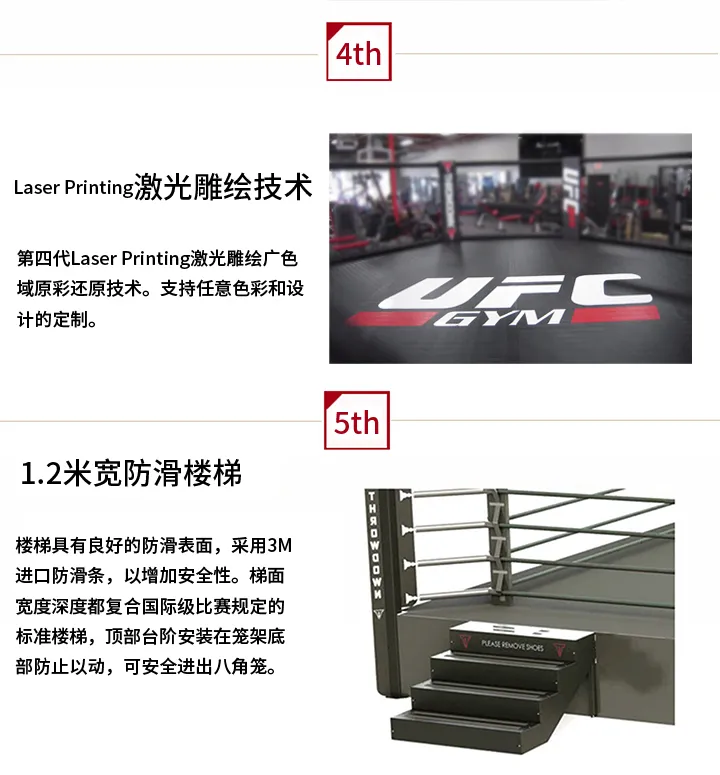 3.拳击台立柱均采用加厚的保护层,再这之前会进行精细的打磨,保证每一个面板构件都有一个光滑平整安全的包装,以此创造一个安全的运动环境。